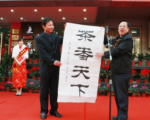 开业仪式上,空政文工团将军姚明、国防大学研究生院将军胡钦佩、海军航空兵后勤部将军祁荣祥、西城区人大常委会副主任杨有成、西城区人民政府副区长郭怀刚、西城区商务委主任郭新、中国茶叶流通协会秘书长吴锡端、北京市茶业协会会长白文祥等领导为更香茗茶金沟河店开业剪彩。当各位领导将花团剪下的瞬间,更香总部以全线统一的VI体系、统一的主题、统一的装修风格为背景的连锁店新模式已整装起航。