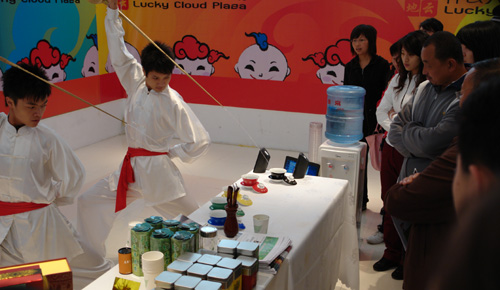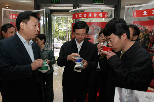 开幕式上,顺义区区长张廷昆、北京市商务局副局长阎小彦等领导出席,并到老字号展示区参观。现场各家老字号企业将纷纷亮出绝活,进行各自非物质文化遗产项目的传统技艺表演。荣宝斋的国家级非物质文化遗产代表性传承人王丽菊将在现场展示木版水印技艺;另有盛锡福的皮帽制作技艺,内联升手工布鞋制作技艺,戴月轩湖笔制作技艺,都一处烧麦制作技艺。茶文化也是老北京的重要传统文化之一,更香公司的特色茶艺表演——长嘴壶茶艺赢得了现场阵阵掌声,张延昆区长、阎小彦副局长等给予更香公司高度赞扬。