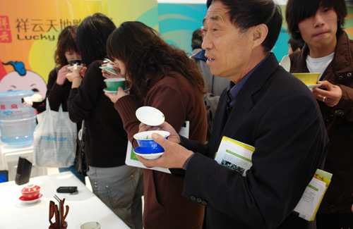 北京市顺义区区长张廷昆(右)、市商务局副局长阎小彦(左)品尝更香有机茶。