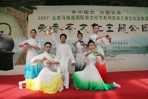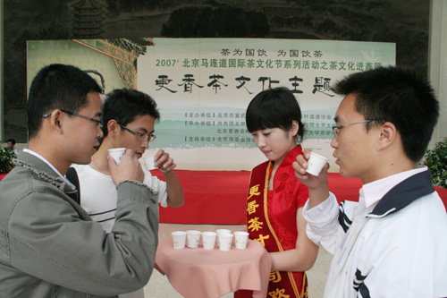 9月28日,为助力2007’北京马连道国际茶文化节,由北京市宣武区人民政府、中国茶叶流通协会主办、由共青团北京市宣武区委员会、共青团北京大学委员会、北京更香茶叶有限责任公司、北京大学茶学社承办的“更香茗茶主题公园”活动在北京大学百年讲堂举行。