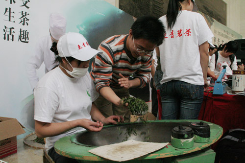 好奇的大学生亲手尝试炒茶