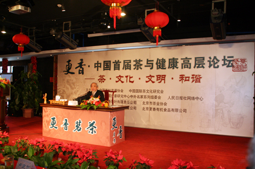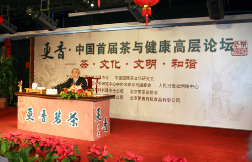 各位来宾,各位朋友,由中国茶叶流通协会,中国国际茶文化研究会,国资委研究中心中外名家系列讲座组委会,人民日报社网络中心联合主办,由北京更香茶叶有限公司,北京市茶叶协会,北京更香文化有限公司,北京更香有机食品有限公司承办的更香•中国首届茶与健康高层论坛,现在开始!