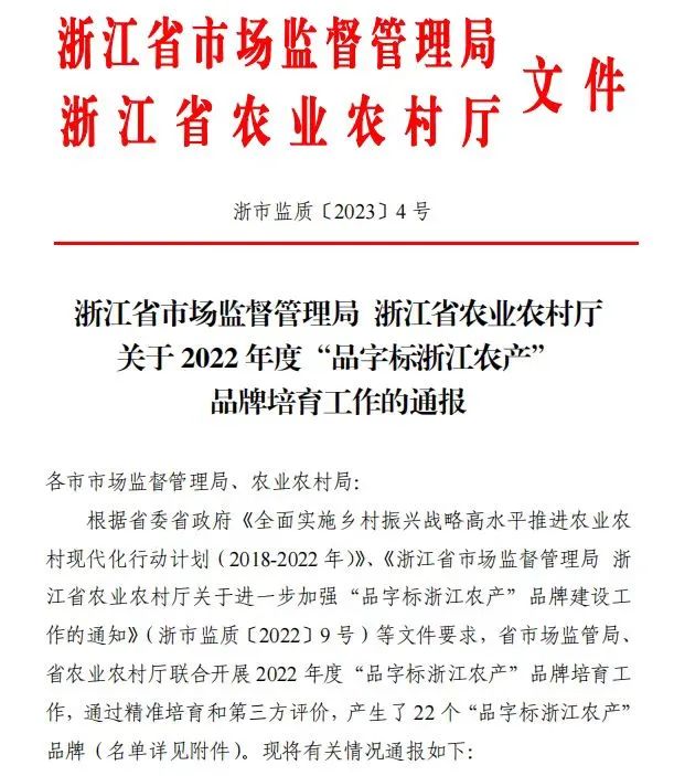 “品字标浙江农产”是浙江省“品字标”公共品牌在农业领域的子品牌,代表浙江省农业领域的高品质和先进性形象。更香公司在金华市市场监管局、农业农村局各级部门的指导下进行申报工作,组织企业相关人员宣贯品牌建设专题培训,邀请相关技术专家进行上门辅导等举措,力争申报通过率。最终顺利通过形式审查、资料评审、现场评审、第三方评价等审查程序,获得“品字标浙江农产”品牌企业称号。
