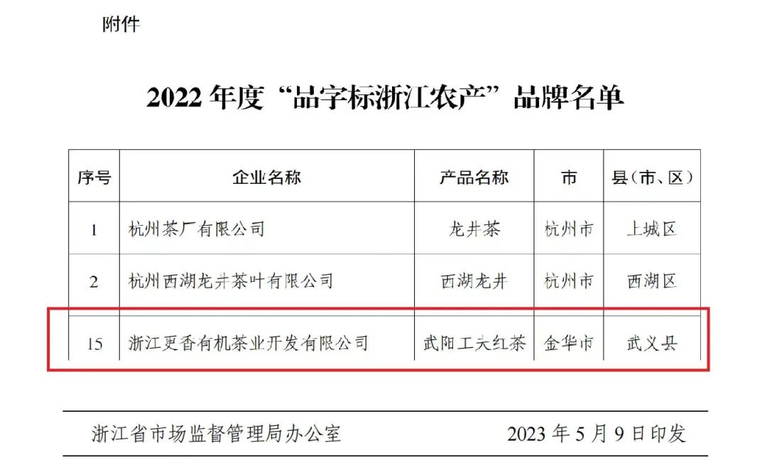 近日,浙江省市场监管局、省农业农村厅联合公布了2022年度“品字标浙江农产”品牌企业名单,全省仅22家企业入选,浙江更香有机茶业开发有限公司榜上有名,成为武义县首家“品字标浙江农产”品牌企业,标志着实现“品字标”公共品牌建设农业领域新突破,也是更香公司在企业高质量发展道路上迈出新的一步。