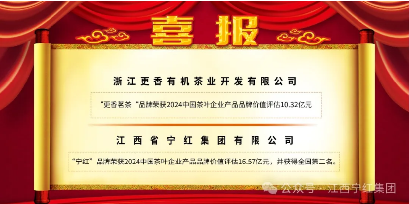2023年12月,浙江大学CARD中国农业品牌研究中心、中国农业科学院茶叶研究所 《中国茶叶》 杂志、浙江大学茶叶研究所、中国国际茶文化研究会茶业品牌建设专业委员会和浙江永续农业品牌研究院等机构联合组建课题组,延续2011年开始的“中国茶叶企业产品品牌价值研究”(评估对象不包含我国港、澳、台地区)公益课题,开展第十四次评估研究。通过数月的数据收集、分析,得出相关数据及其分析结论结果中,更香茗茶品牌(浙江更香有机茶业开发有限公司)、宁红品牌(江西省宁红集团有限公司)获2024中国茶叶企业产品品牌价值评估分别为10.32亿元和16.57亿元。