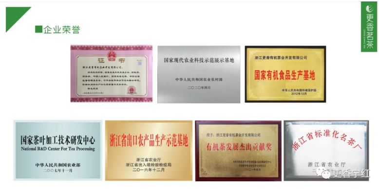 公司以“绿色、健康、养生”的有机茶作为主导产业,打造了“公司+合作社+市场+基地+茶农”的“绿色产业链”,在浙江、广西、江西、福建等地联结建立有机、绿色茶园6万多亩。购置茶园管理农机120多台及各类自动化、清洁化生产线20多条,跨越绿茶、红茶、白茶、黑茶、乌龙茶、花茶等茶类的加工,年加工能力2000多吨。先后通过质量管理(ISO9001)、食品安全管理(ISO22000)、环境管理(ISO14001)、职业健康管理(OHSAS18001)、良好农业规范(GAP)以及国际市场认可的可持续农业标准“雨林”、食品安全FSSC22000等体系认证;“更香有机茶”得到欧盟EC、美国NOP和杭州中农认证中心“三重”有机产品认证。以北京为销售中心,辅射全国开设200多家门店。拥有自营出口权,产品远销欧、美等发达国家,得到国内外消费者的一致好评,荣获50多个奖项。
