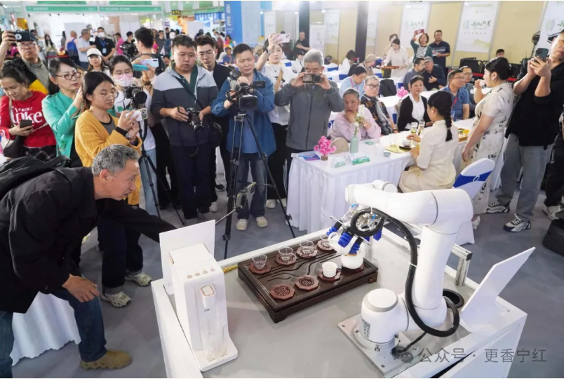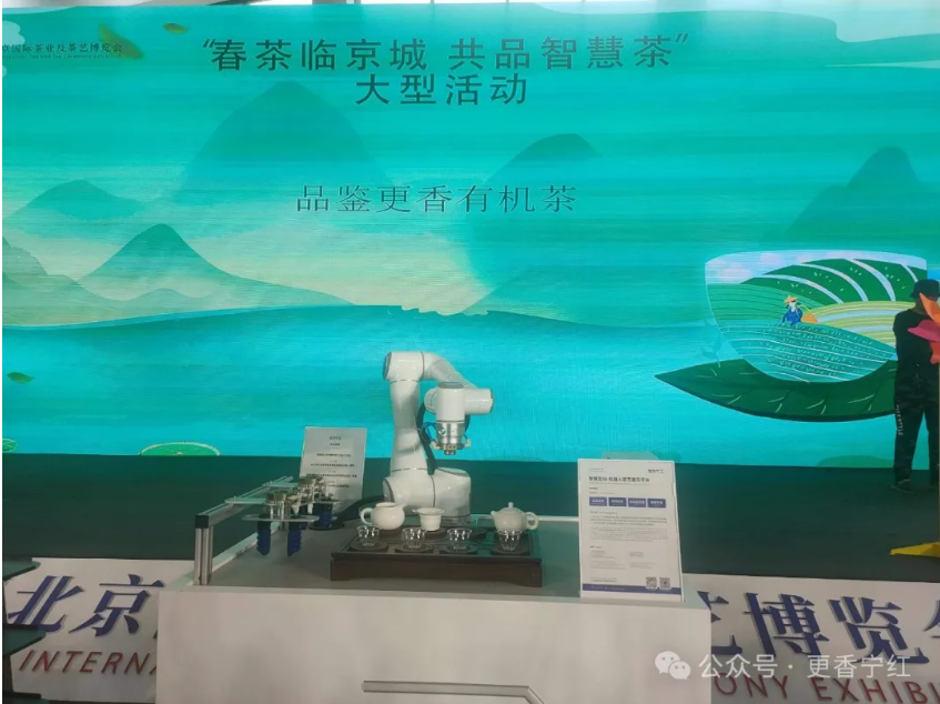 此次活动由更香茶艺师与智慧机器人展示茶艺引起关注。在活动现场一边由机器人采用高度灵活性的机械臂,搭载两套不同型号的末端夹爪进行茶艺制作,如同人的双手一样灵活,给茶友们泡茶;而另一边由更香茶艺师与传送机器人协同表演茶艺“长嘴壶”,让观众大饱眼福。即能够喝到有机绿茶又能够现场茶艺与机器人的表演。