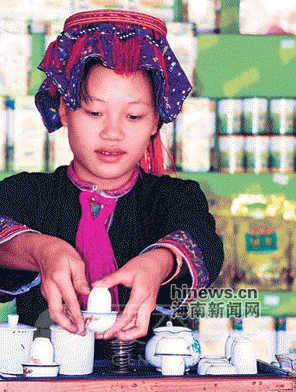 水满乡姑娘为顾客泡茶。 本报记者 张杰 摄