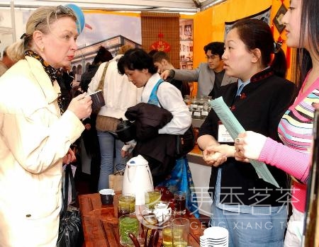 5月21日,在莫斯科红场旁举行的世界茶叶节上,两名中国姑娘向一名俄罗斯妇女介绍四川雅安茶厂生产的中国藏茶。旨在展现世界各地茶文化的莫斯科第二届世界茶叶节当天开幕,来自中国、日本、印度及俄罗斯等10余个国家的60多家公司参展。