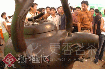 图为在本次交易会上展出的世界上最大的紫砂茶壶——它高2.2米,重约220公斤,可泡出味道极佳的好茶水。