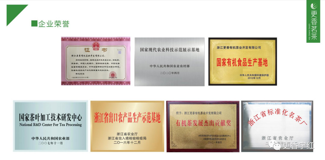 浙江更香有机茶业开发有限公司成立于2001年,是国内最早开发有机茶的种植、加工、销售、研发、农旅于一体的农业产业化国家重点龙头企业、国家有机食品生产基地。在武义投资建立占地1000多亩集观光体验、科普教育、示范种植与文化推广四大功能的更香有机茶文化示范观光园。2020年由农业农村部认定为国家现代农业科技示范展示基地。