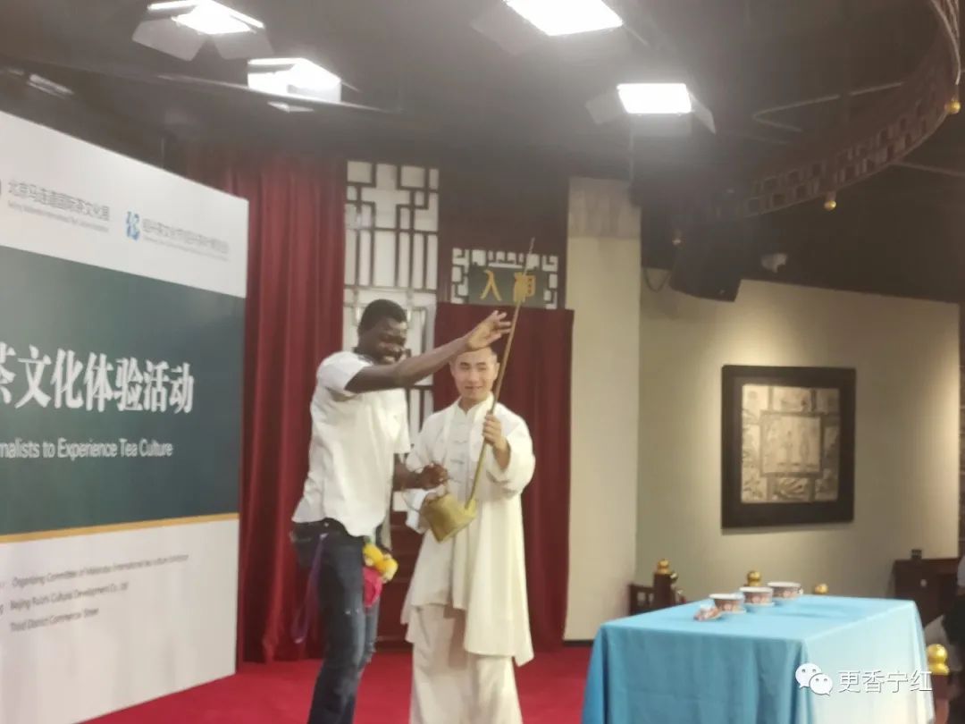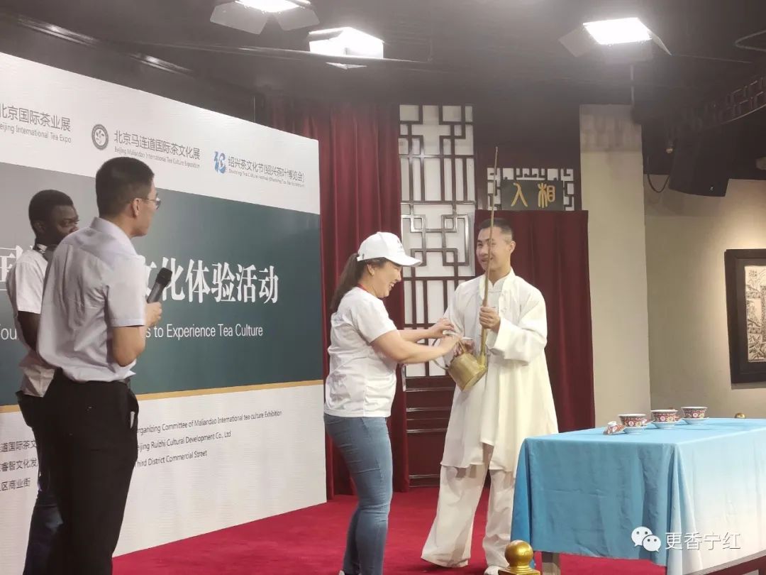 在节目中,由北京更香宁红茶业有限公司演出的《长嘴壶》,吸引了外国友人极高兴趣,并亲身上台体验茶艺表演,有茶艺师王玉东一一指导。
