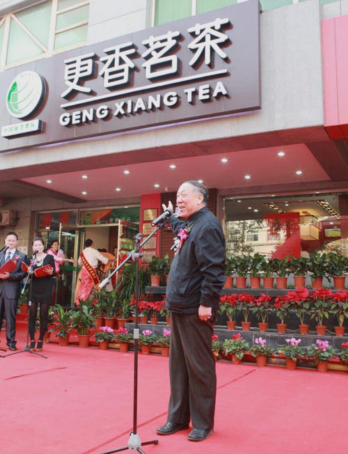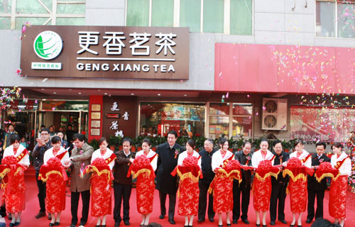 开业仪式上,空政文工团将军姚明、国防大学研究生院将军胡钦佩、海军航空兵后勤部将军祁荣祥、西城区人大常委会副主任杨有成、西城区人民政府副区长郭怀刚、西城区商务委主任郭新、中国茶叶流通协会秘书长吴锡端、北京市茶业协会会长白文祥等领导为更香茗茶金沟河店开业剪彩。当各位领导将花团剪下的瞬间,更香总部以全线统一的VI体系、统一的主题、统一的装修风格为背景的连锁店新模式已整装起航。