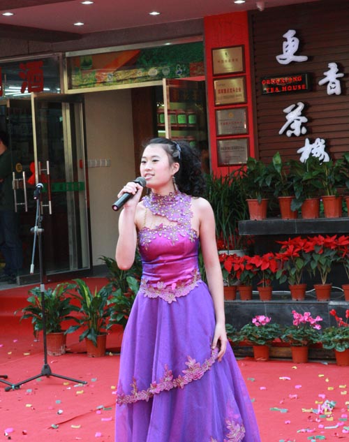 更香公司茶艺队作为压轴大戏,当场精彩献艺,领导、嘉宾兴致勃勃的观赏了茶艺表演,精彩处掌声不断,周边群众现场观看,热情高涨,一群可爱水灵的浙江小姑娘,真情演绎了女儿出嫁前,母亲教的最后一杯《青青女儿茶》;之后经过中央电视台晋级《星光大道》4轮比赛已成功晋级月赛六强的王巧,以一曲《红红的日子》唱出了更香人对每一位嘉宾及朋友们的美好祝福。最后,更香茶艺队亮出精彩绝活,太极与长嘴壶完美的结合在一起,以更香太极壶艺《乾坤之梦》,共同感受中华民族的和韵雅风。该节目茶艺师们曾为国家主席胡锦涛和国际奥组委主席罗格献艺,深受好评。