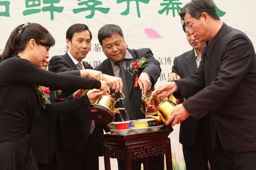 北京市宣武区商务委主任宋伟、区商务委副主任周振波等共沏6碗清茶,寓意全民共饮中国六大茶类