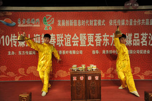 2月7日,由商务部跨国公司促进会指导、东方传媒网主办、更香茶叶公司承办的2010东方传媒网传媒人新春联谊会在更香茗膳府隆重举行。来自人民日报、光明日报、经济日报、中国青年报、中央电视台、北京日报等各大媒体的记者、摄影家、书画家120余名传媒人齐聚一堂,喜迎新春佳节,共话深厚情谊。