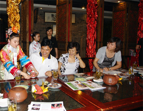 更香茶艺师向浙江嵊州市市委副书记、市长盛秋平(左二)等领导敬茶。