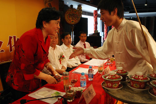 精彩茶艺后,更香茶艺师向原卫生部常务副部长、中国金融工会主席何界生(左)献上用长嘴壶冲泡的俞氏养生茶