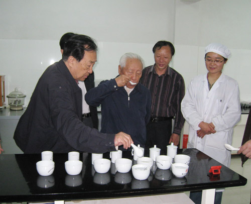 九届全国政协副主席杨汝岱(左二)、原浙江省委副书记刘枫(左一)品鉴更香新绿茶。