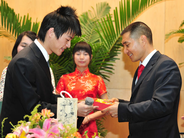 中国农业大学学生代表向俞学文讲师赠送纪念礼品
