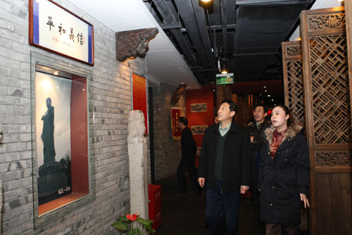 浙江省委常委、中国人民解放军浙江省军区司令员王贺文(左)和公司总经理朱丽俐等领导欣赏企业文化
