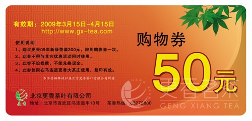 3、购买更香09年新绿茶满300元,可凭更香公司网站下载的电子代金券获得50元优惠。
