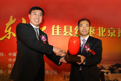 佳县县长柴小平(左)向更香公司董事长俞学文(右)赠送红枣模型