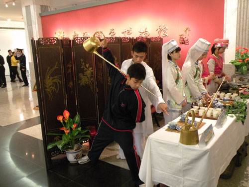 12月3日下午,蓝天博览课展示活动在中国邮票博物馆举行,北京东直门中学、第五十中学等院校的学生参加此次活动。在此次活动上,东直门中学除了有白族茶艺表演、回族刮碗子茶表演外,更特邀更香茶叶有限公司茶艺师表演长嘴壶茶艺。