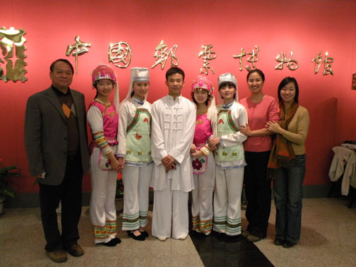更香茶艺师(中)与东直门中学的师生在中国邮票博物馆合影