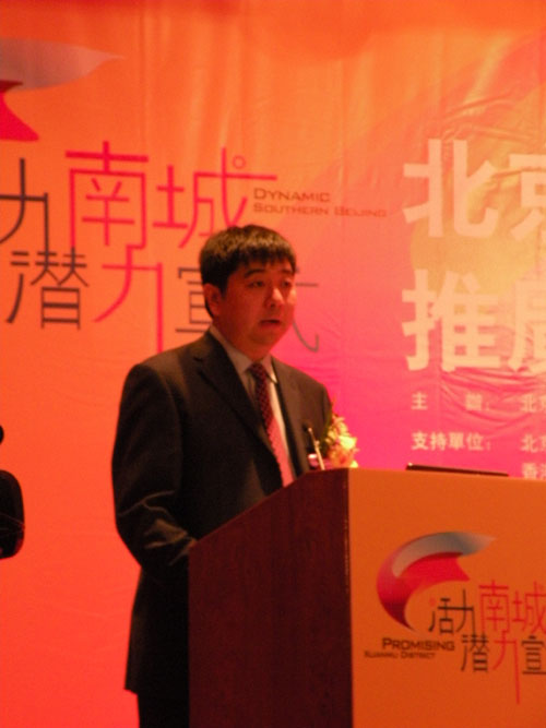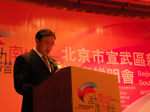 宣武区区长王刚在“北京市宣武区新城发展推广说明会”上致词