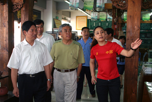 更香公司总经理朱丽俐(右)向中国私个协会长甘国屏(左)、北京市私个协会长金鑫(中)、宣武区私个协会长李广隆(左二)介绍茶庄