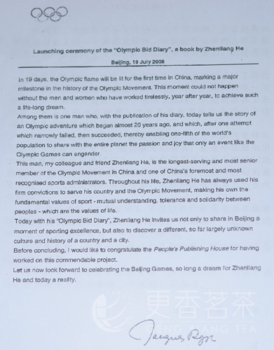罗格在贺信中表示,十九天后,奥林匹克圣火将首次在中国点燃,竖立起奥林匹克运动史上一个重要里程碑。“我的同事和朋友何振梁是中国在奥林匹克运动中服务年代最长、资历最深的委员,他的《申奥日记》出版发行,不仅让我们在北京共享体育运动对卓越的追求,并且让我们发现一个国家、一座城市迄今不甚为人们所知的另一种文化和历史。现在,让我们期待北京奥运会这一盛会的开始”。