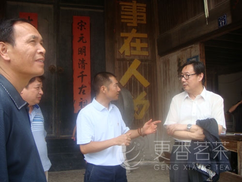 北京商务局副局长周河(右)听取更香公司董事长俞学文对茶厂规划的介绍,领导们表示:参观了更香基地,对企业的规模及实力有了更深的了解