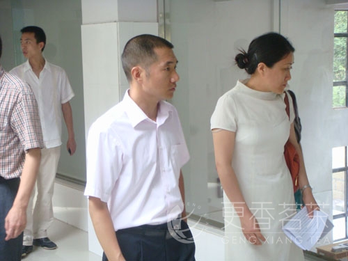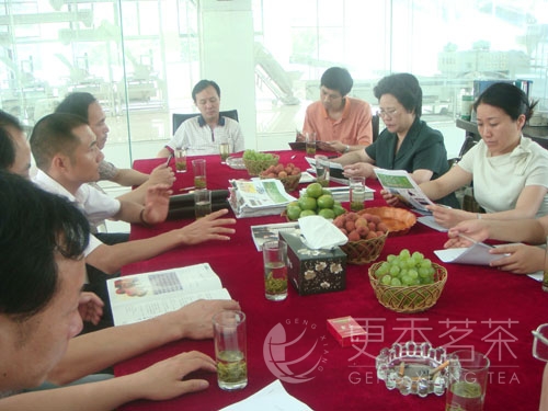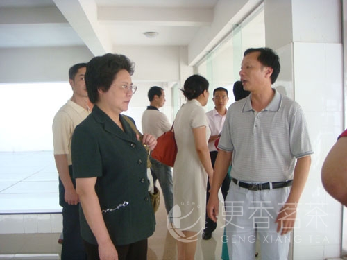 在巡视完各生产车间后,国家财政厅农业综合开发办主任李岩、浙江省财政厅农业综合开发办常务副主任谭景玉等领导一行在会议室听取了项目建设情况的汇报。更香公司董事长俞学文首先就项目申报的背景作了说明。在介绍公司发展史后,他从茶产业的现状谈到项目实施对公司发展的推动作用,并介绍了基地的下一步规划。他说,更香的发展离不开各级领导一路的支持和关怀;项目的实施在提高企业竞争力的同时,带动了更多茶农的参与和增收。随后,基地总经理金国庆详细汇报了项目建设的进程,并介绍了“更香农业专业合作社”的情况。领导一行肯定了以龙头企业带动茶农致富的产业模式,并建议发挥股份所有制优势,通过合作社茶农股份制,推动企业做大做强。