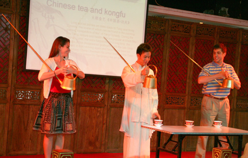 酷爱中国功夫的学生上台体验中国太极茶艺