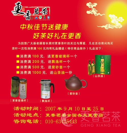 中秋、国庆将至,更香公司特推出系列优惠活动,欢迎广大顾客光临更香茗茶各大直营店。