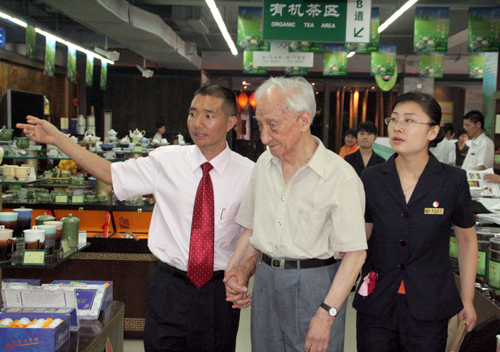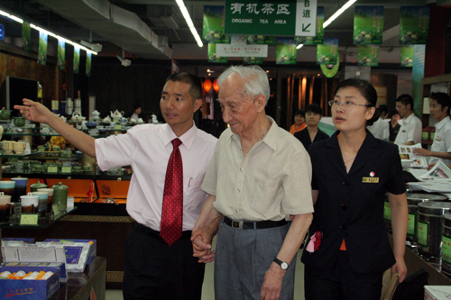 著名农学家方悴农老先生(中)在更香公司董事长俞学文陪同下参观更香总部大茶庄