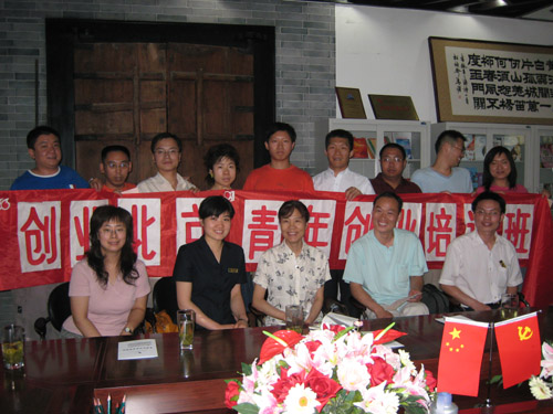 6月10日,中国青年创业国际计划北京办公室主任于萍(中)带领11位学员参观更香公司。学员们听了更香公司董事长俞学文的创业故事,并在会议室举行了结业典礼。