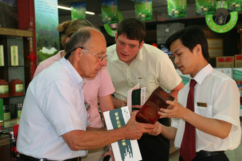 代表团成员首先参观了更香总部大茶庄,这所全球最大茶庄的经营规模及其特色的有机茶系列产品等一开始就让这些外国朋友兴致大增。随后,在更香茶楼百茶厅内,更香公司董事长俞学文向来访者介绍了更香的品牌发展历程以及对未来的发展规划,并由更香艺术团献上了精彩的长嘴壶茶艺和绿茶茶艺。对于这位以2000元起家的茶农经营企业的发展史, Richard Watson院长和他的学生们都表示由衷的敬佩,并期待能在美国街头早日见到更香直营店。