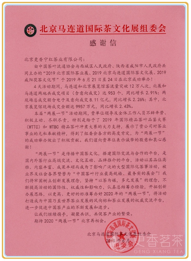 近日,北京更香宁红茶业有限公司收到来自北京马连道国际茶文化展组委会关于“两展一节”的一封感谢信。让我们一起盘点一下,在本届“两展一节”期间,更香宁红走过的点点滴滴。