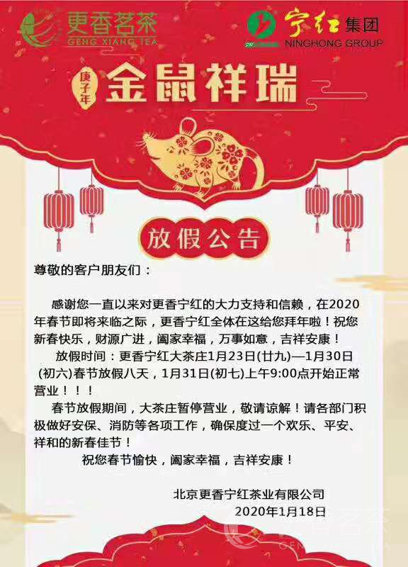 现将更香宁红马连道店春节暂时停业及办公放假时间公告如下,更香宁红祝伟大的祖国繁荣昌盛,祝家人们春节快乐,阖家幸福,吉祥安康!