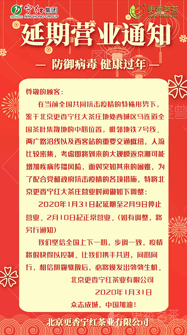 更香宁红大茶庄自1月31日延期至2月10日开始营业,给您带来不便,敬请谅解!!!
