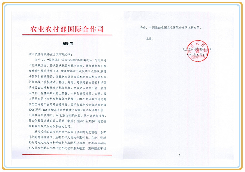 二十年戮力前行,如今浙江更香有机茶业开发有限公司已经发展成为农业产业化国家重点龙头企业,中国有机茶领军品牌,有机茶出口欧盟等国家,更香有机茶架起中外合作友谊的桥梁,走出了一条中国有机茶绿色发展之路。俞学文说,能得到农业农村部国际合作司的认可,这是对我们茶行业的信任和支持,今后我们定当更加努力,为振兴中国茶产业做出最大贡献。