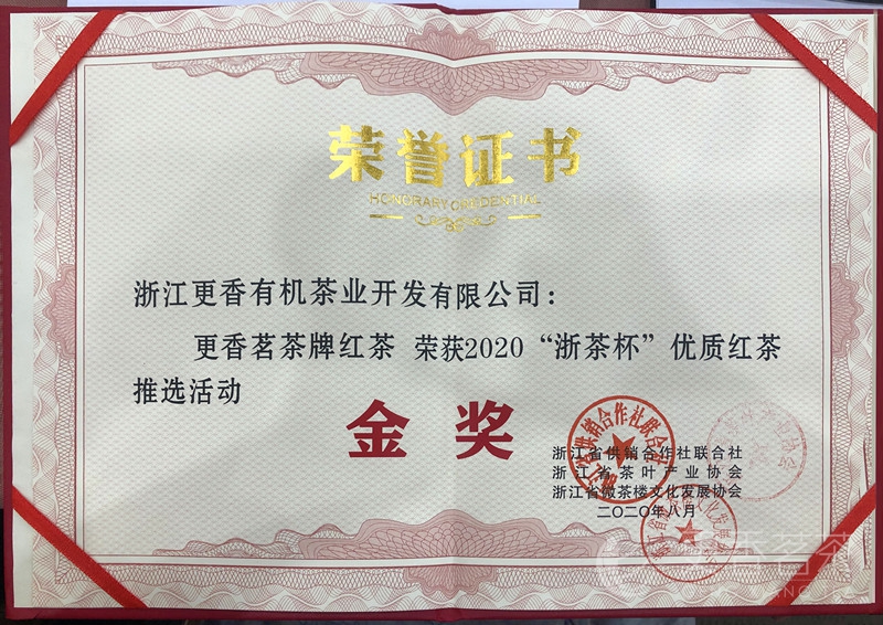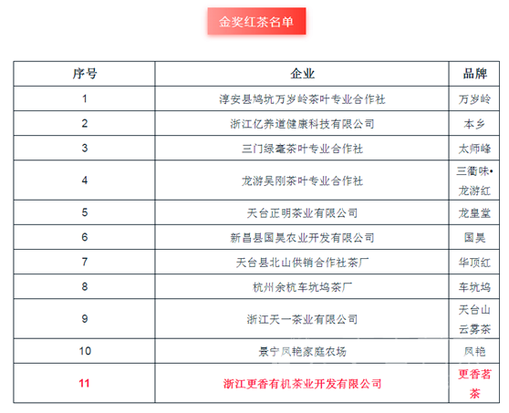 由浙江省农合联、浙江省茶叶产业协会、浙江省微茶楼文化发展协会共同主办的第八届“浙茶杯”优质红茶评选结果揭晓,浙江更香有机茶业开发有限公司“更香茗茶”牌红茶等11件产品获得金奖,名列前十名(第10名与第11名评分相同,并列第十),杭州九曲红梅茶业有限公司“天香”牌红茶等10件产品获得银奖,台州市旭日茶业股份有限公司“济公”牌红茶等40件产品获得优胜奖。