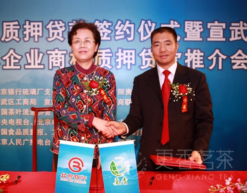 2010年1月21日上午,更香有机茶商标质押贷款签约仪式暨宣武区中小企业商标质押贷款工作推介会在马连道更香茶楼举行。宣武区区长助理谢全林、北京市工商局商标处处长张建设、中国茶叶流通协会秘书长吴锡端、北京银行中小企业事业部副总经理徐毛毛、北京银行琉璃厂支行行长李路平、副行长陈琪等领导,以及宣武区近50家中小企业负责人参加了会议。此外,来自人民日报、中央电视台、农民日报、中国食品质量报、人民网、新浪网、搜狐网等60多家新闻媒体单位参加了活动。北京银行琉璃厂支行李路平与北京更香茶叶有限责任公司董事长俞学文现场签署商标质押贷款协议,为更香公司提供800万元贷款。