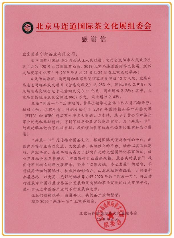 来自北京马连道国际茶文化展组委会的一封感谢信