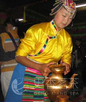 茶,是青藏高原以藏族为主体的包括门巴族、裕固族、土族、蒙族、珞巴族以及夏尔巴人等各族人民生活中不可缺少的饮料,是他们生活结构中一个重要组成部份。茶又是待客的上品。藏族民谚云“宁可三日无粮,不可一日无茶”,道出了藏族人民与茶“难舍难分”的关系。
