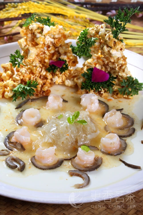 Raw material: 15 gram Gengxiang Wulv (organic tea), 100 gram fin, 8 shelled fresh shrimp, 50 gram scallop meat, 50 gram scallop egg, 50 gram sea cucumber.