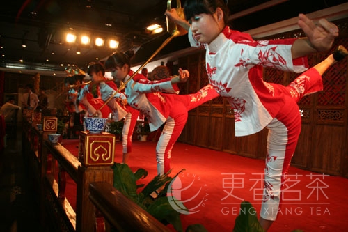太极茶艺融体操、太极、禅学、易理俞一炉,刚柔并济,充满玄机妙理。每一式长嘴壶行云流水的沏茶艺术与太极拳绵绵不绝的招式吻合,招招景驰浪奔,如行云流水,令人目不暇接,心动神摇。出神入化的表现出他们长绳系日的风采,太极舞蹈的柔美、武术的夸张、书法的气息,展现中华茶文化的精髓。