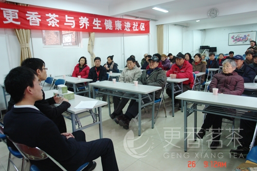 1月28日,更香茶与健康养生讲座走进白纸坊双槐里社区。中国的六大茶类是什么,日常喝什么茶好?居民们表现出很大的热情。在观看茶艺表演后,更香公司向现场的每个人获赠了一份俞氏养生茶